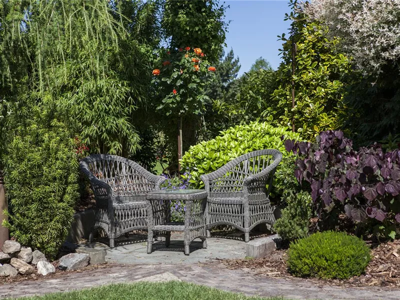 Beim Thema Sitzplatz denken die meisten als erstes an eine großzügige Terrasse, die direkt am Haus und am besten in südlicher Ausrichtung liegt. Aber warum soll das schon alles sein? Erst durch verschiedene Sitzmöglichkeiten und damit variierenden Blickwinkeln erlebt man den Garten viel intensiver. Außerdem kann man so auf unterschiedliche Bedürfnisse und die jahreszeitlichen Veränderungen eingehen. Bei Höchsttemperaturen im Sommer wünscht man sich beispielsweise eher ein schattiges Plätzchen, während man im Frühling und Herbst jeden Sonnenstrahl aufsaugen will. Denken Sie also ruhig weiter als nur bis zur Terrasse. Wie wäre es zum Beispiel mit einem einfachen Klappstuhl und einem Bistrotisch, die schnell mal ans duftende Beet gerückt werden? Oder eine Hängematte, die im lichten Schatten zweier Bäume zum Träumen einlädt? Leichte Möbel, die problemlos zu transportieren sind, geben Ihnen dabei Flexibilität.