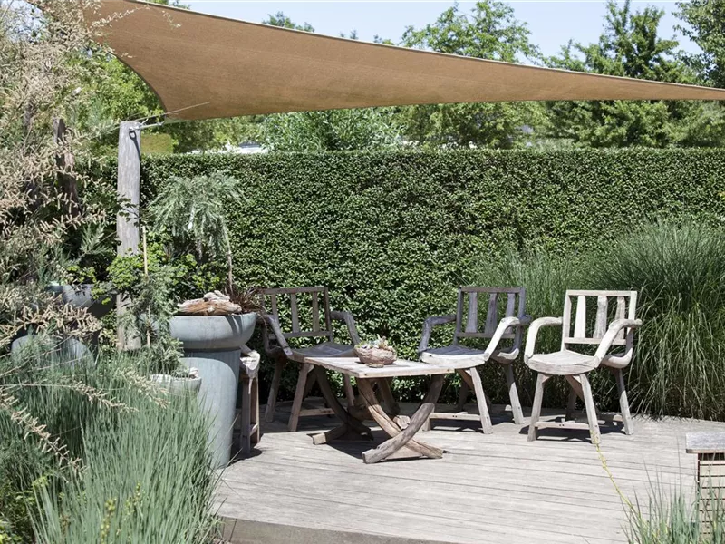 Fürs Wohlbefinden ist am Sitzplatz etwas "Rückendeckung" notwendig, denn der Mensch hat das Bedürfnis sich geschützt zu fühlen. Wählen Sie für Ihren Sitzplatz deshalb einen Strauch, eine Hecke, eine Mauer oder ein begrüntes Rankelement als Abgrenzung oder als Hintergrund. Gegebenenfalls ist ein weiterer Sichtschutz notwendig. Ganz flexibel sind Sie mit Paravents oder gespannten Stoffbahnen, die gerade bei einem mobilen Sitzplatz vor unerwünschten Blicken schützen.